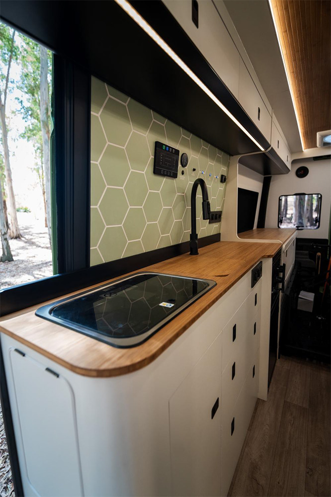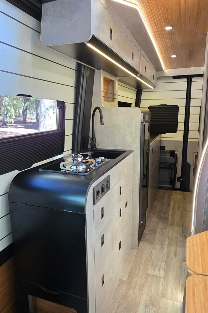 Cocina compacta y funcional que ha sido diseñada especialmente para acompañarte en cada viaje, haciendo que cocinar en la carretera sea tan cómodo como en casa.