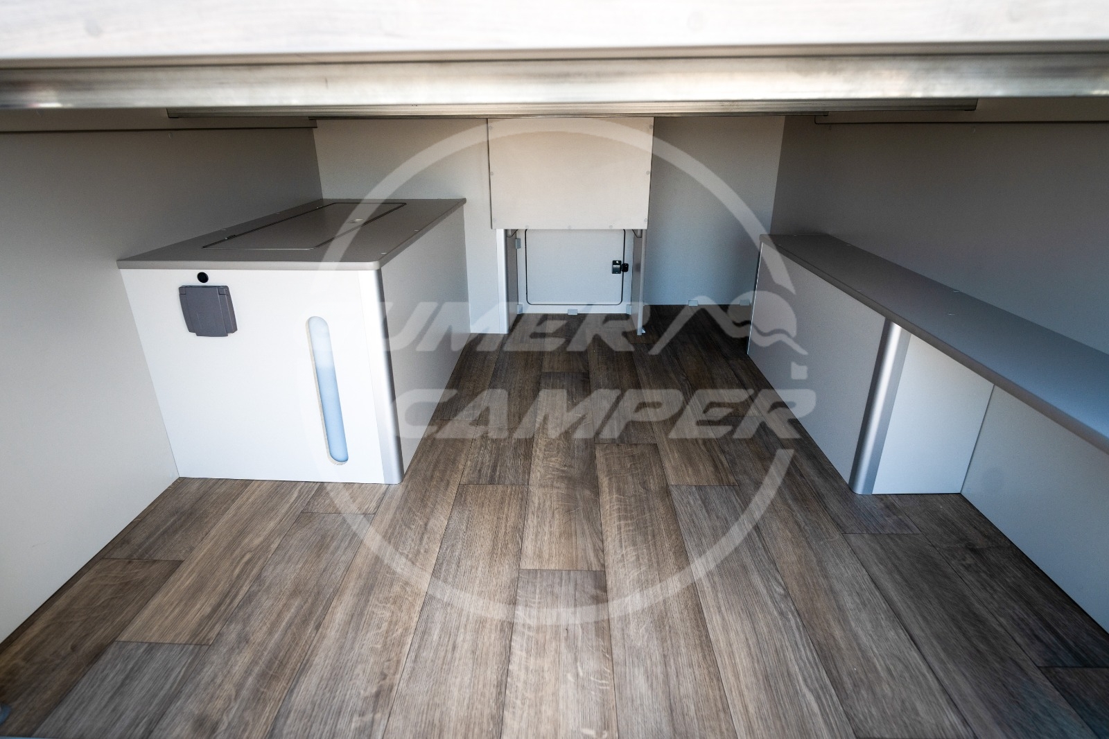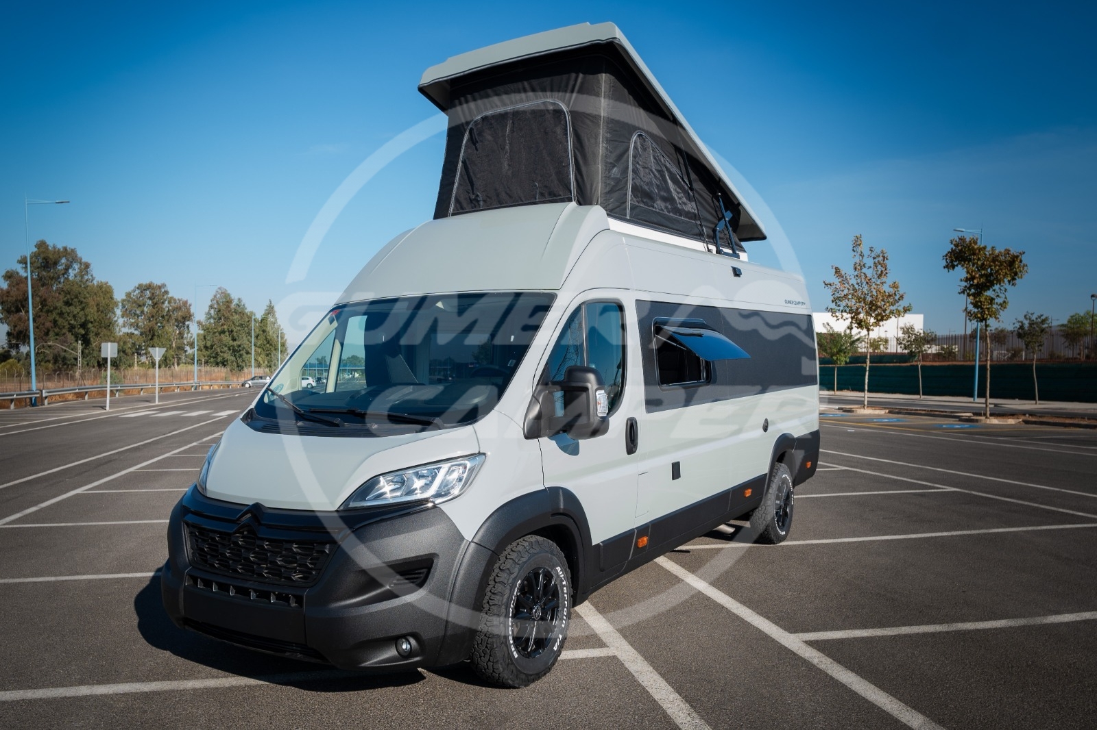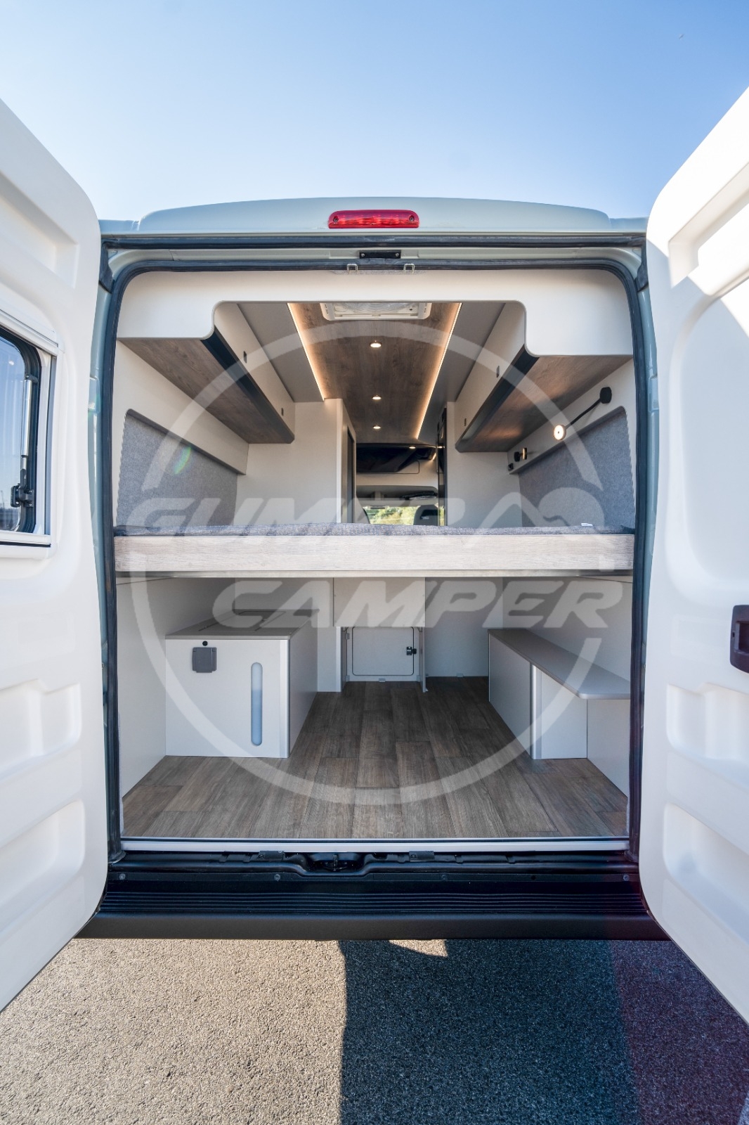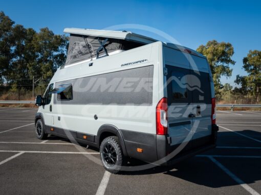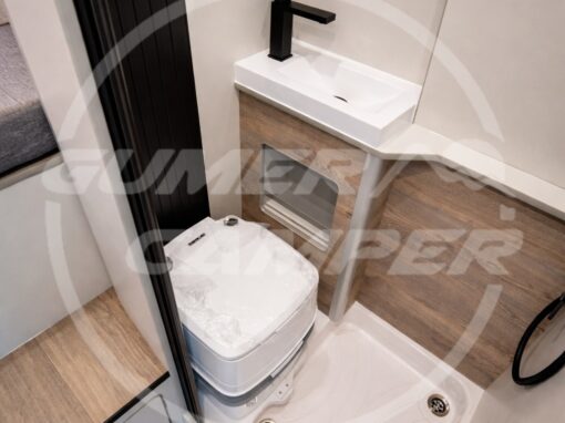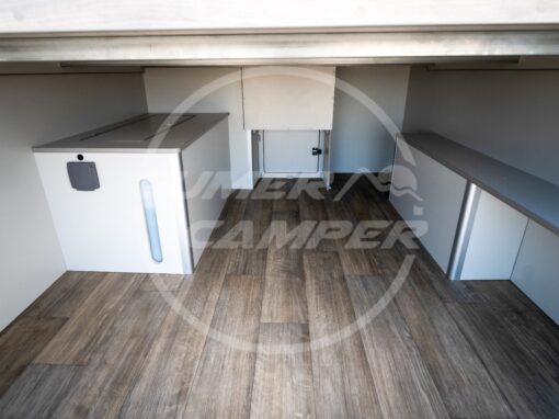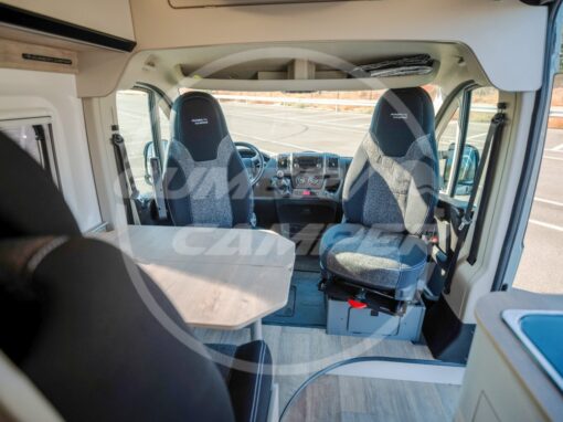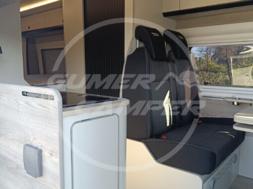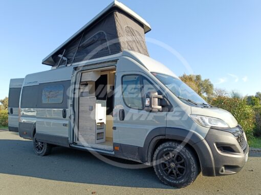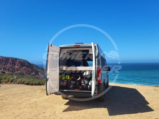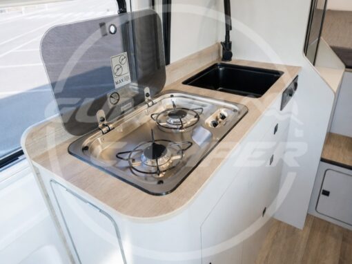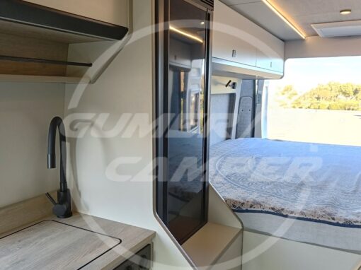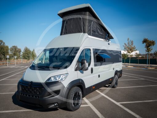 Pensada para una familia apasionada de los deportes acuáticos, la distribución prioriza un gran espacio de almacenaje que permite transportar cómodamente todo el material necesario. Aun así, no se renuncia a las comodidades de una camper completa: cocina totalmente equipada, nevera de gran tamaño, baño completo, cama de amplias dimensiones y capacidad para viajar y dormir cuatro personas.