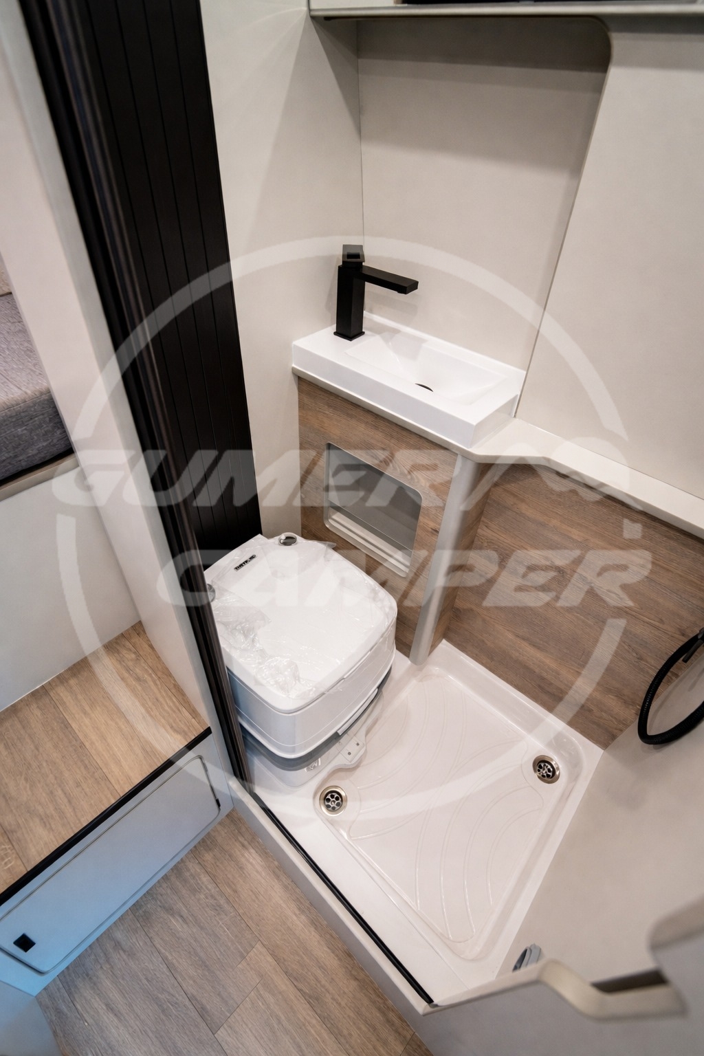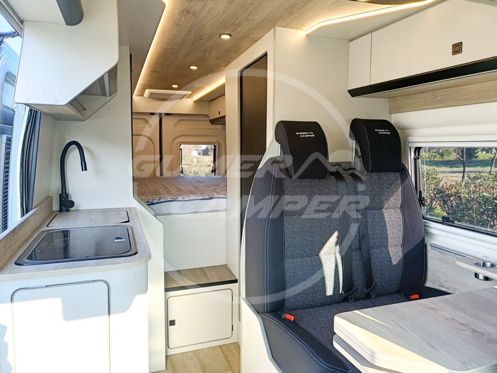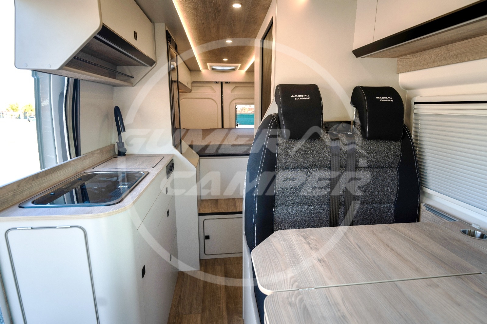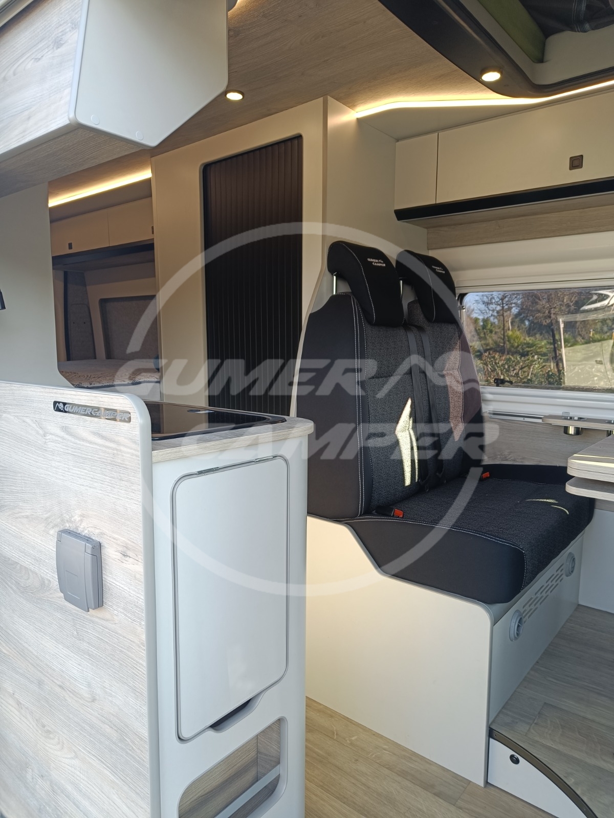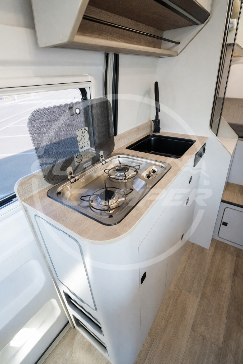 Pensada para una familia apasionada de los deportes acuáticos, la distribución prioriza un gran espacio de almacenaje que permite transportar cómodamente todo el material necesario. Aun así, no se renuncia a las comodidades de una camper completa: cocina totalmente equipada, nevera de gran tamaño, baño completo, cama de amplias dimensiones y capacidad para viajar y dormir cuatro personas.
