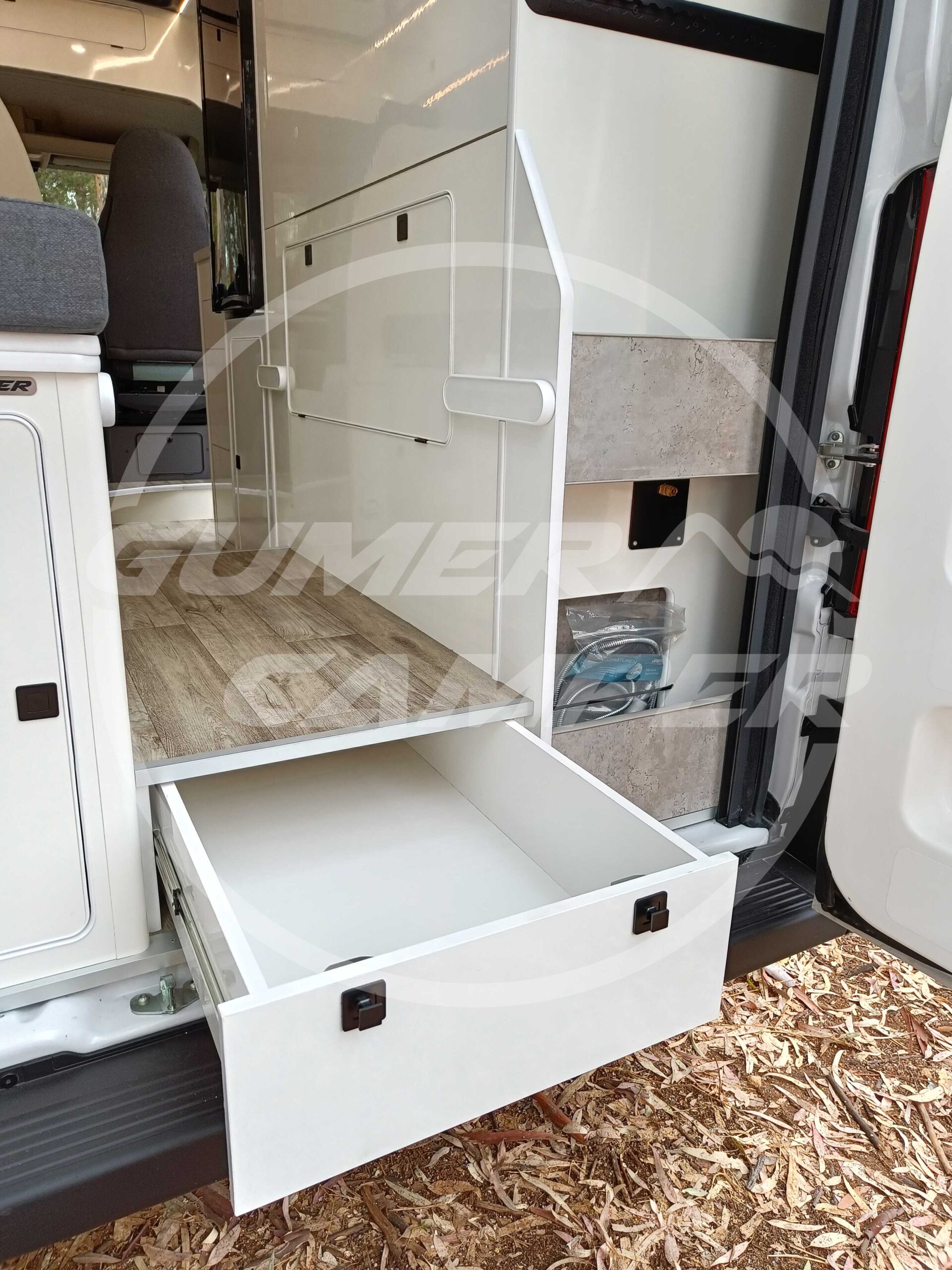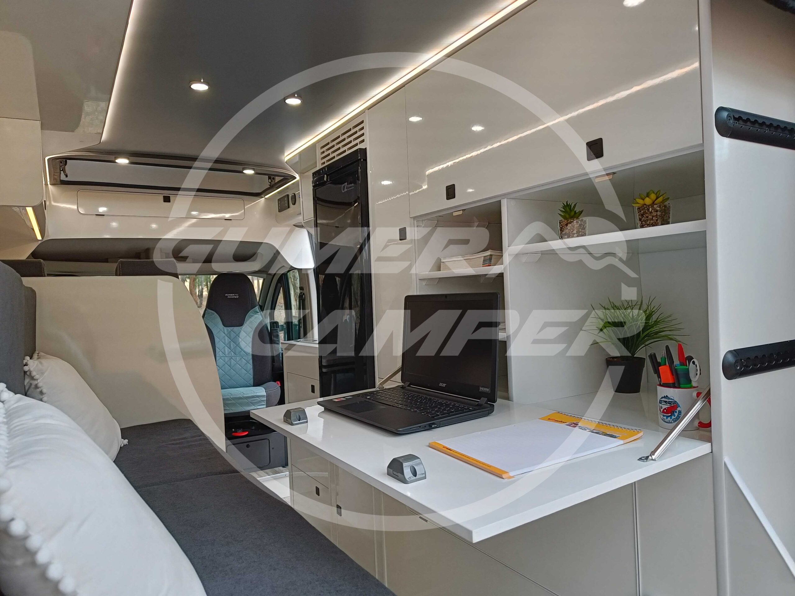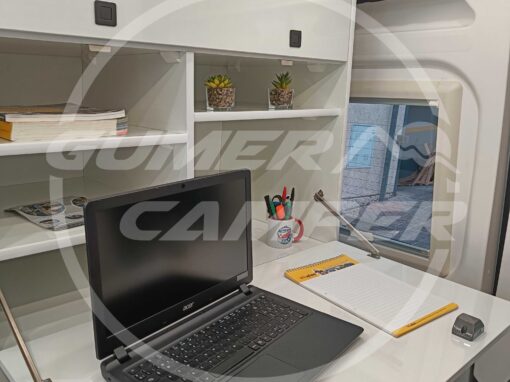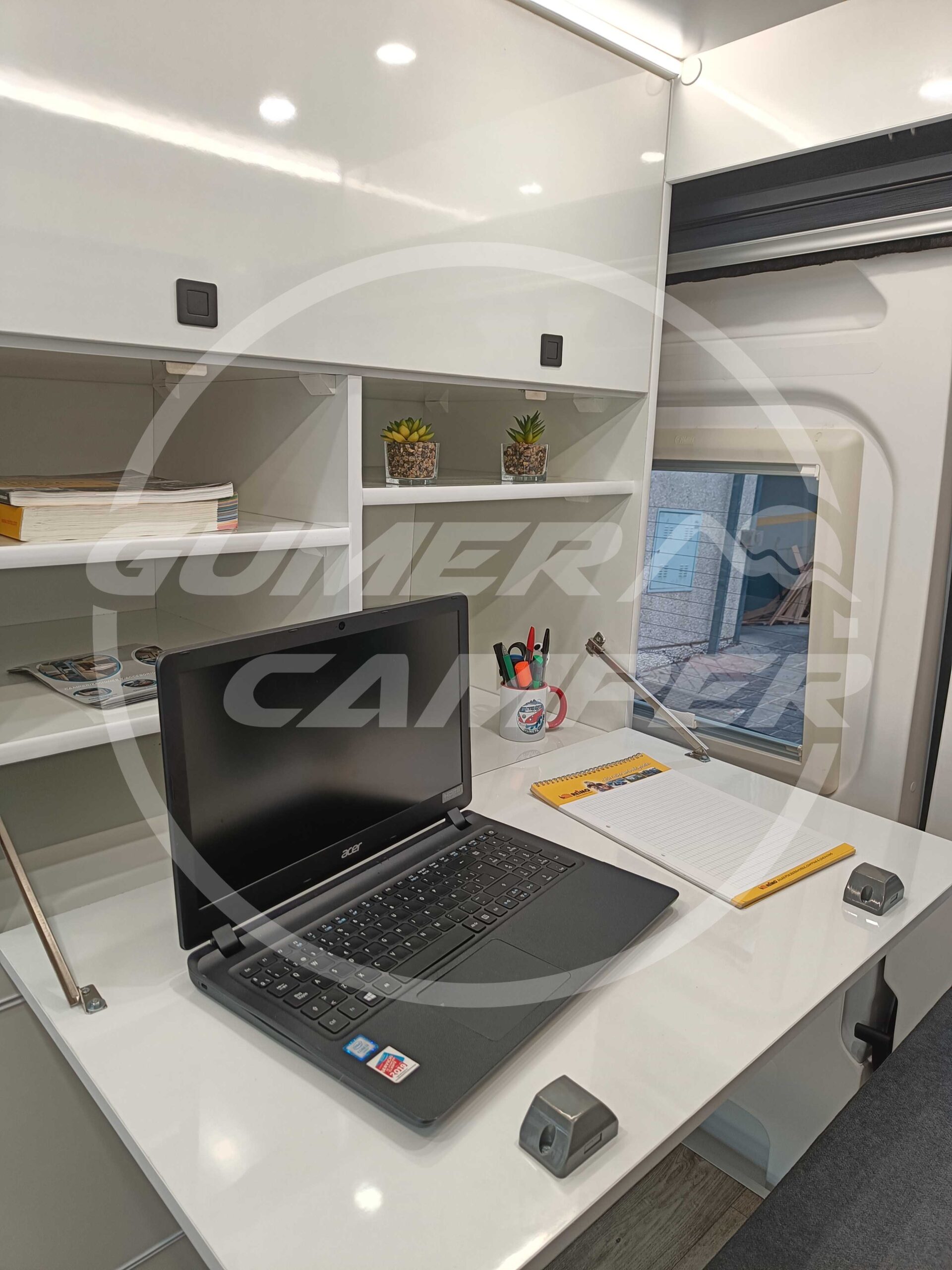 El objetivo principal de este proyecto ha sido fusionar la libertad del viaje con la funcionalidad de un espacio de trabajo. El escritorio plegable en la zona trasera proporciona un área de trabajo cómoda y eficiente para realizar todas las tareas.