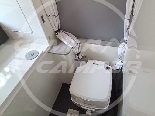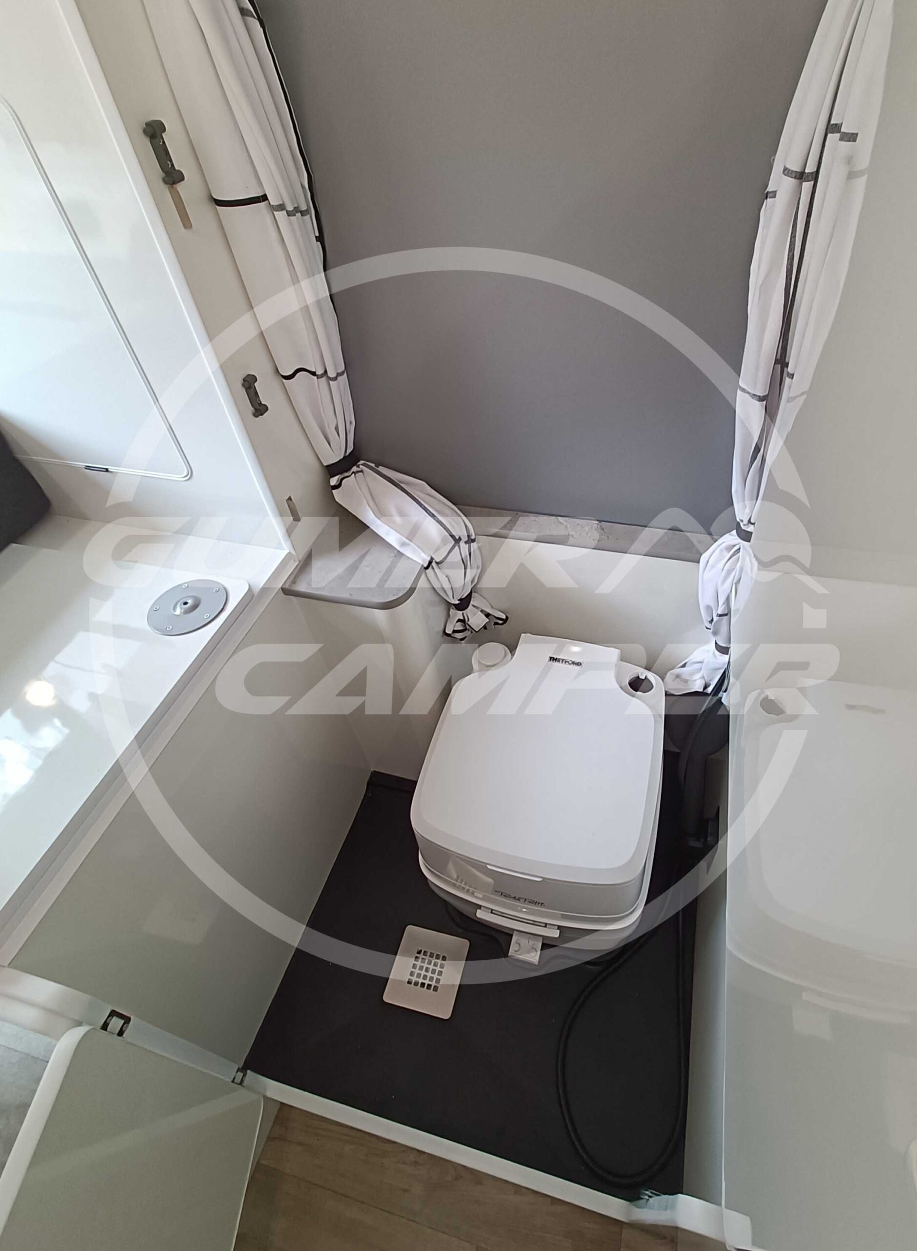 El mayor desafío de este diseño ha sido, sin duda, el baño. Hemos incorporado un innovador baño plegable que se oculta bajo el sofá, ocupando espacio solo cuando es necesario, lo que maximiza la funcionalidad del interior sin sacrificar la comodidad.