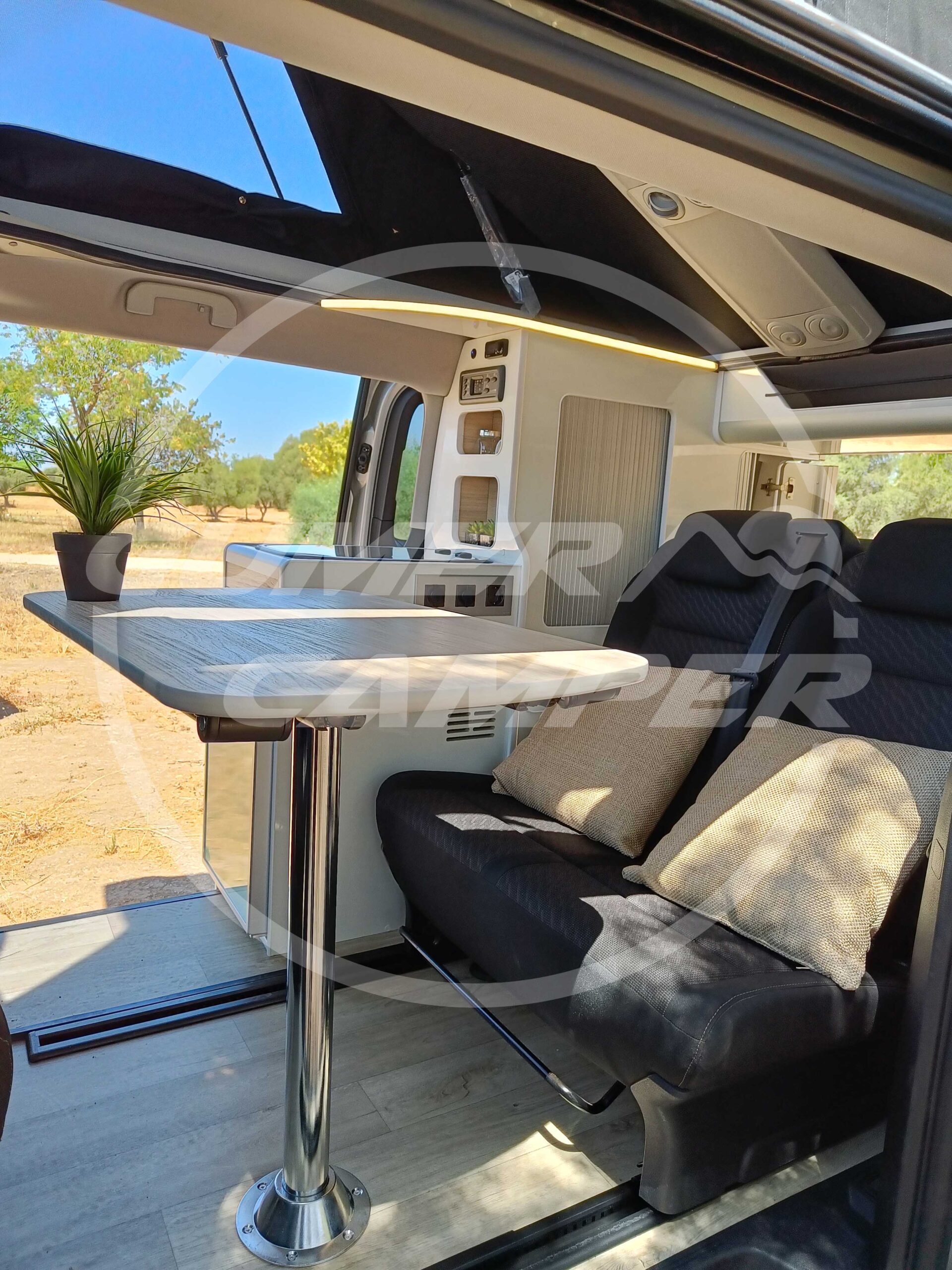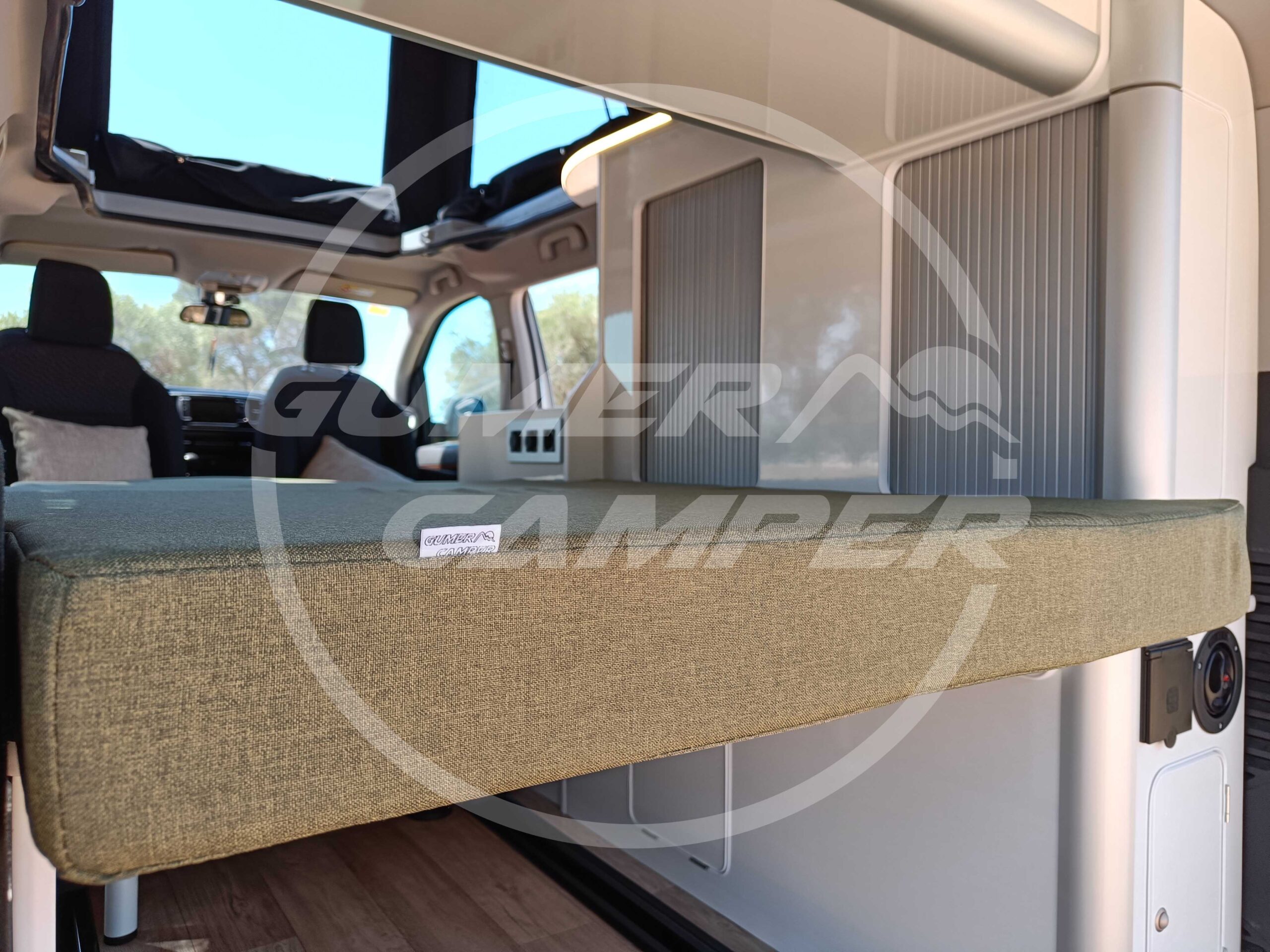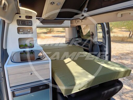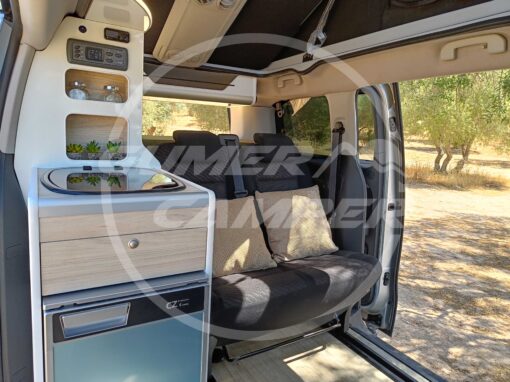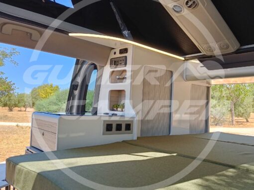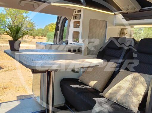 Con esta camperización, hemos logrado crear un entorno totalmente funcional, aprovechando perfectamente el espacio. La combinación de blanco y madera crea un ambiente cálido y acogedor. La transformación ofrece todo lo necesario para viajar con comodidad y en un ambiente súper agradable