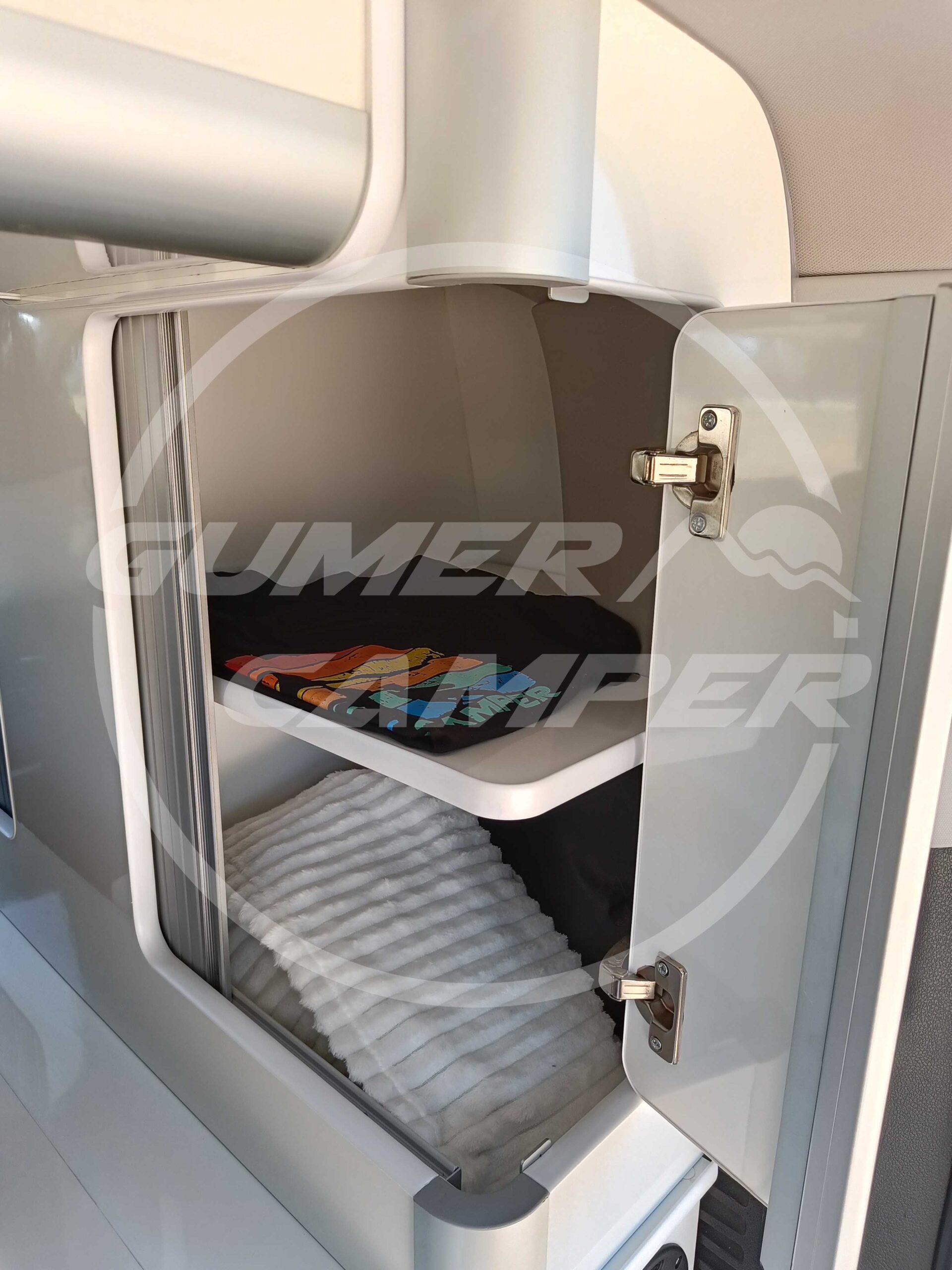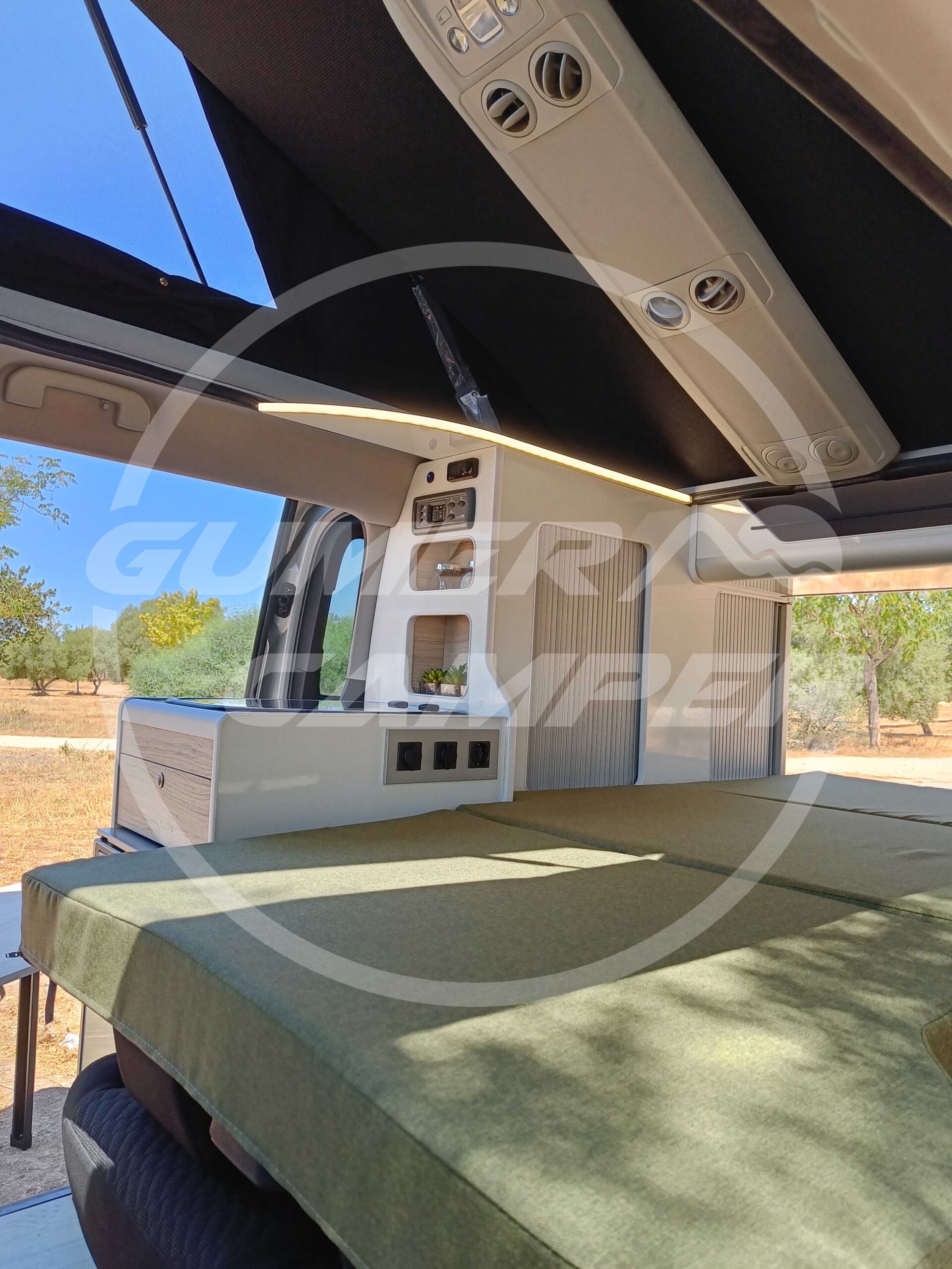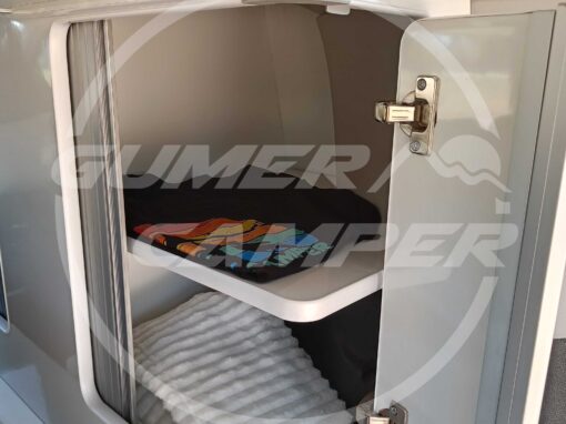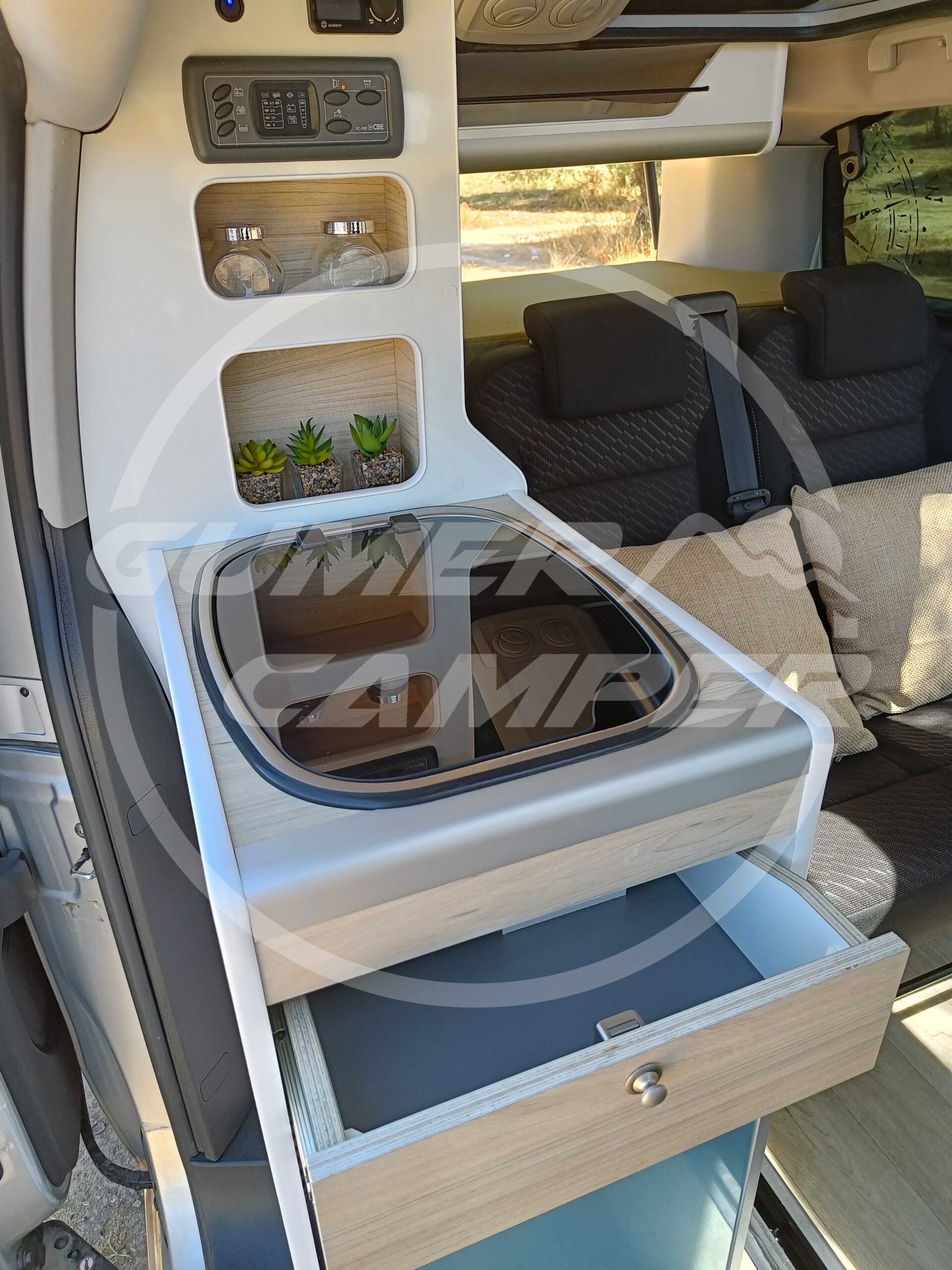 Con esta camperización, hemos logrado crear un entorno totalmente funcional, aprovechando perfectamente el espacio. La combinación de blanco y madera crea un ambiente cálido y acogedor. La transformación ofrece todo lo necesario para viajar con comodidad y en un ambiente súper agradable