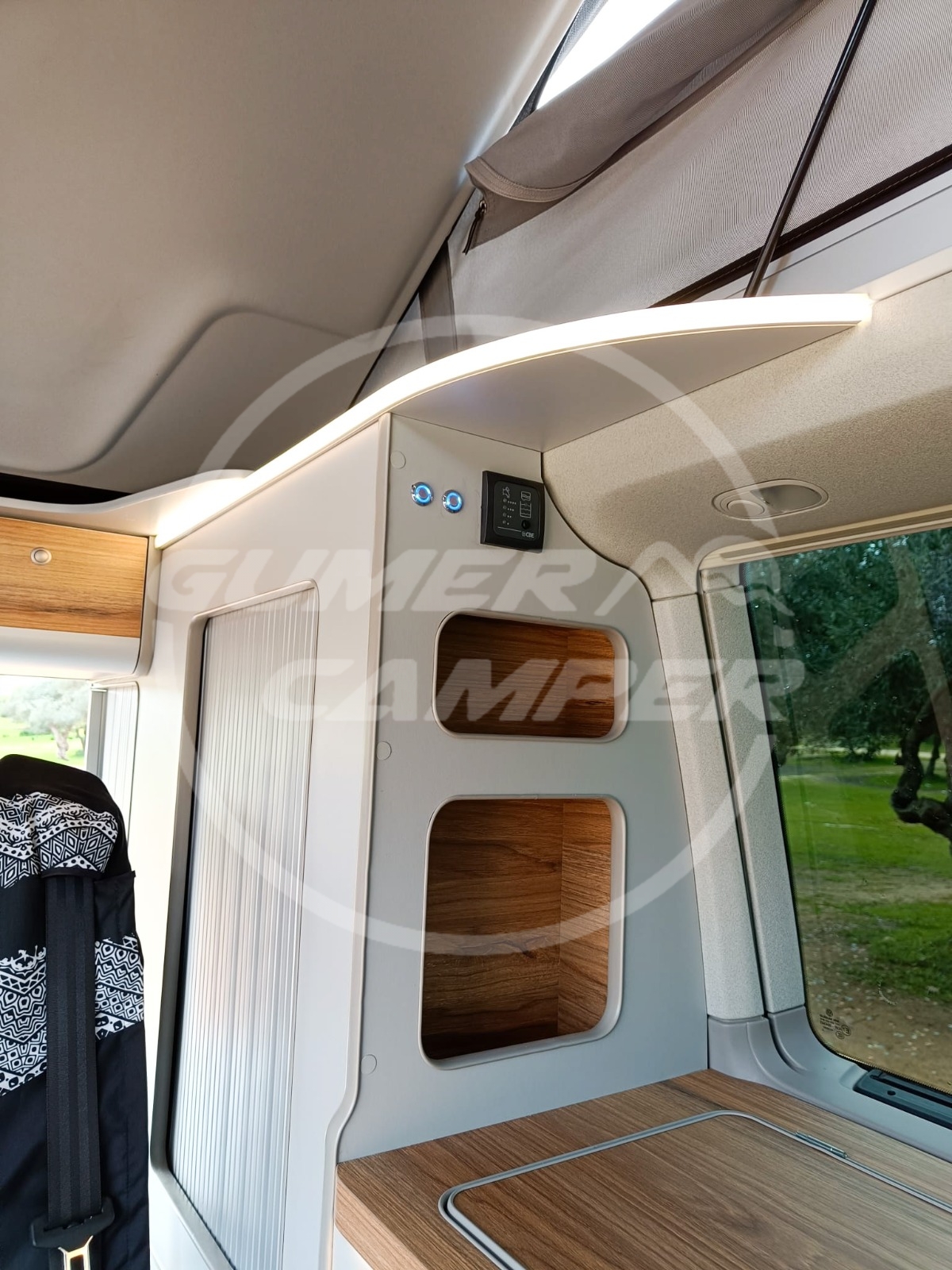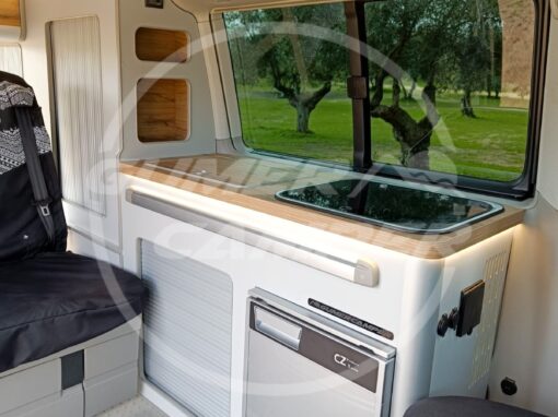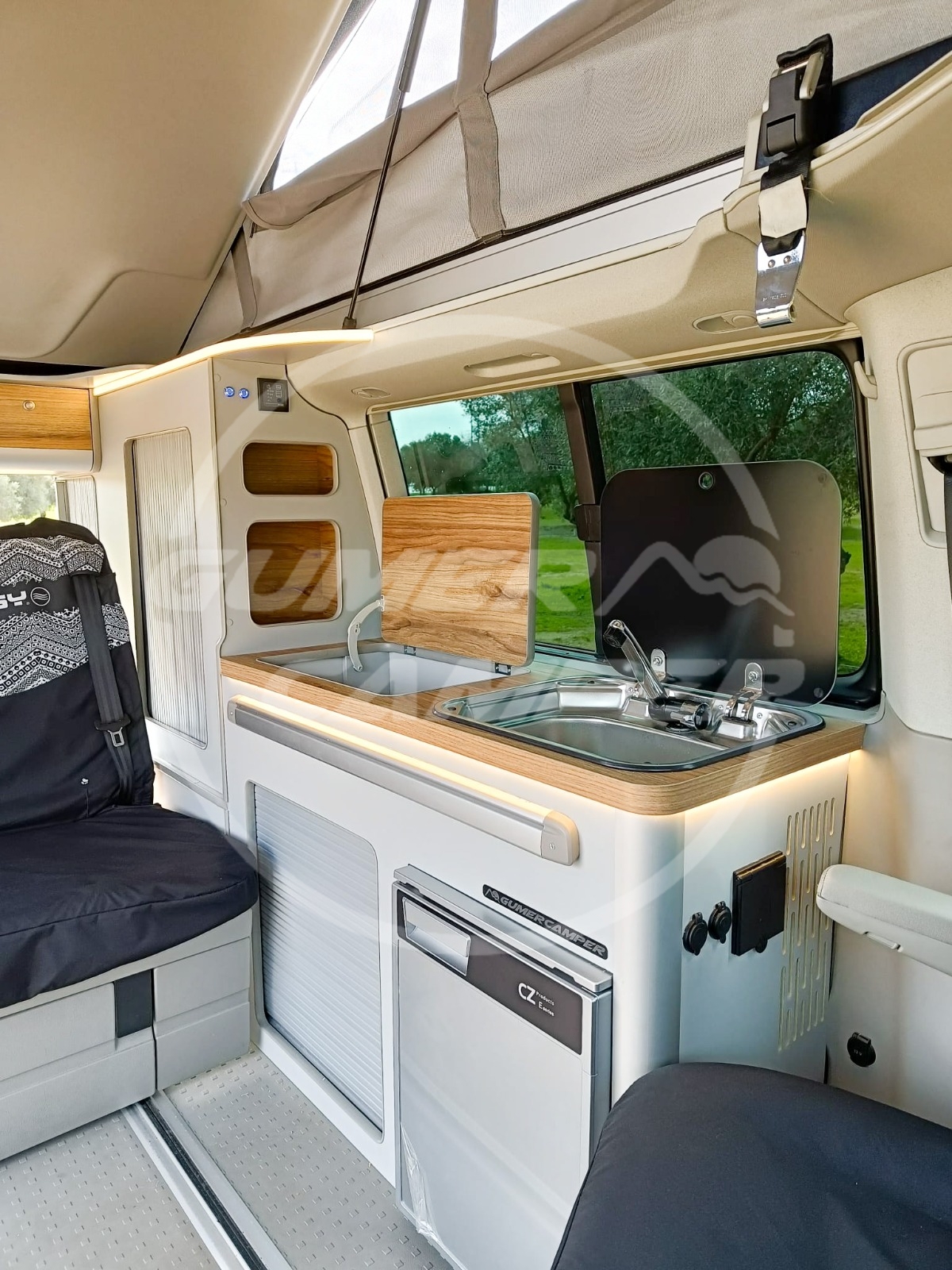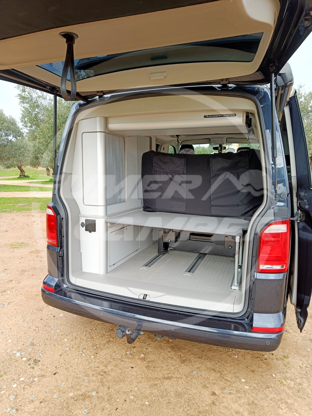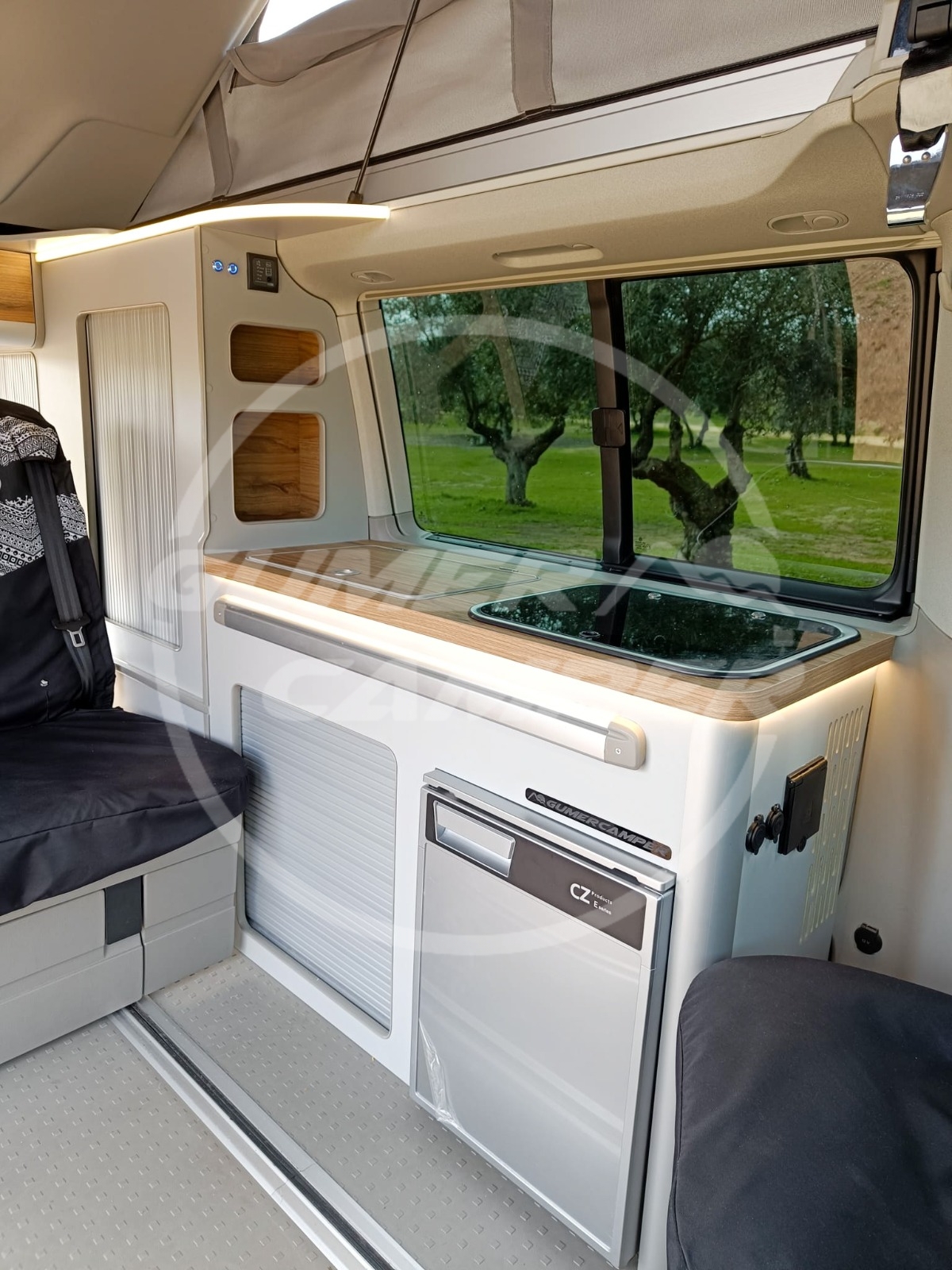 En este proyecto hemos transformado una Volkswagen California Beach original, incorporando mobiliario lateral y ampliando su equipamiento para hacerla aún más funcional y completa.